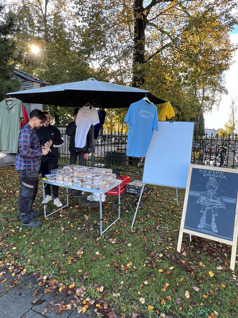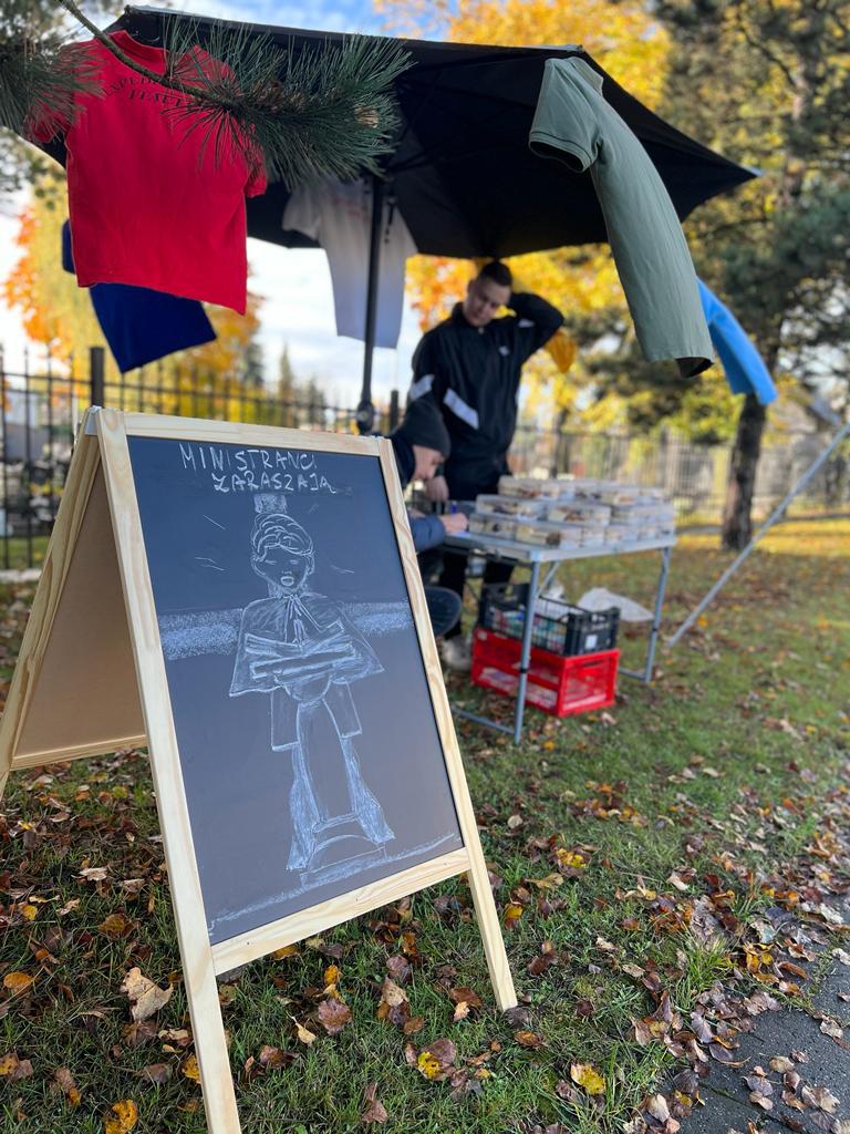 Od 28 października do 2 listopada wystawiliśmy stragan obok cmentarza z ciastami, które przygotowaliśmy wraz z naszymi rodzinami. Ciasta były różne, więc pokrojone kawałki wkładaliśmy na przemian do pudełek tak, aby w jednym opakowaniu były rożne smaki. Przygotowaliśmy lemoniadę i ciepłą herbatę z goździkami, którymi częstowaliśmy ludzi przed cmentarzem.